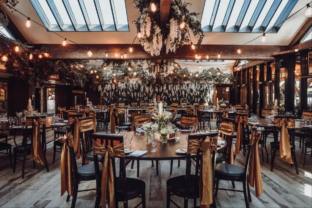 Natural light pours through large skylights in the dark wood ceiling of this lodge. White wisteria and greenery hang from the rafters to soften the rustic architecture.
