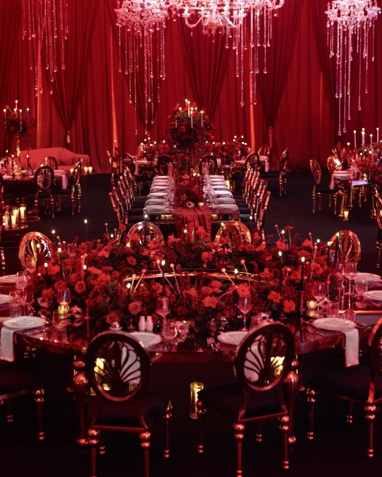 Large circular arrangements of red roses sit atop every mirrored table surface. Black chairs with gold accents contrast sharply against the warm red lighting.
