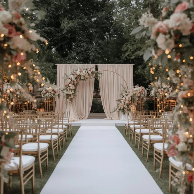 Cream colored drapes provide a neutral screen behind the floral arch. Golden chairs line the white runner for a clean and elegant finish.