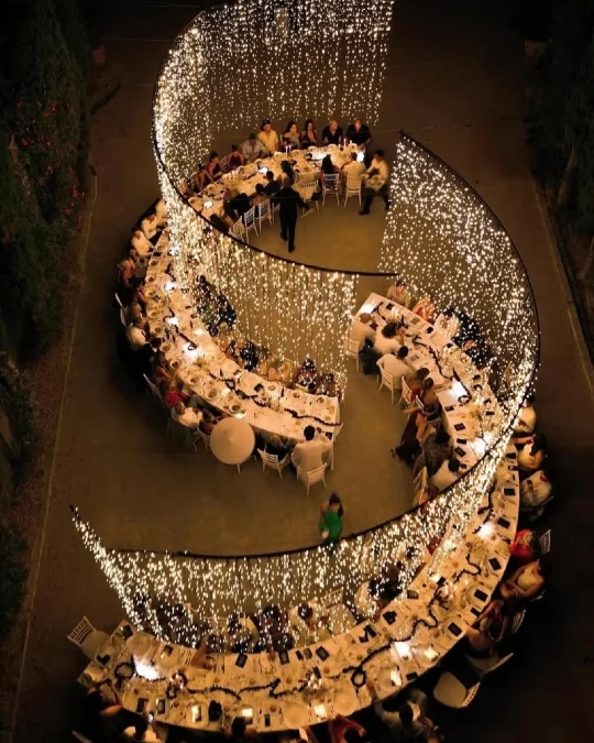 A massive curved table winds through the outdoor space in a unique spiral shape. Thousands of tiny fairy lights hang in vertical strands to follow the table’s curve.
