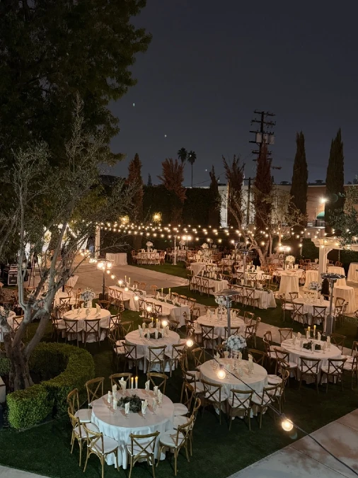 White tablecloths cover round tables scattered throughout the yard. Wooden chairs sit around the dining area for a natural look. Patio heaters stand nearby to keep guests warm in the evening air.