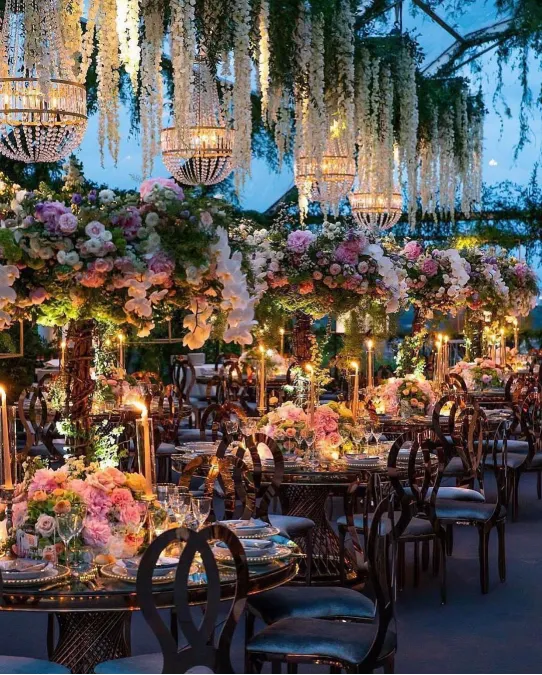 White wisteria vines hang in thick clusters from the ceiling to create a floral canopy. Crystal globe chandeliers nestle among the blooms to provide soft, magical lighting.
